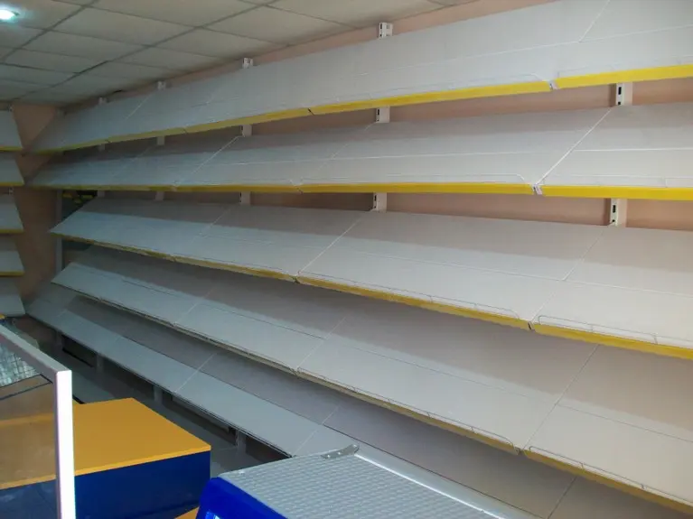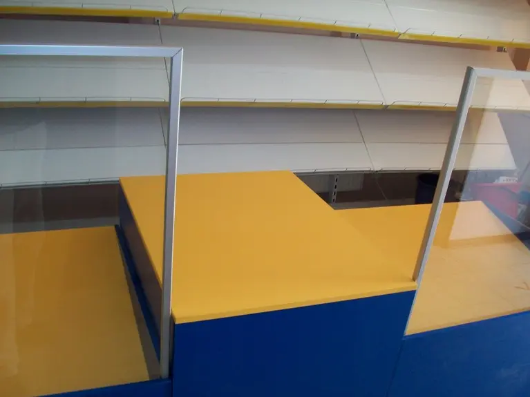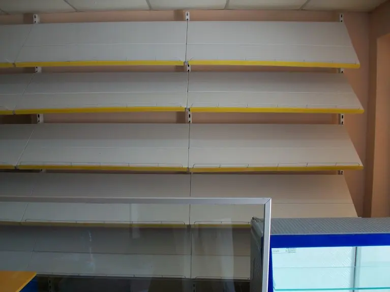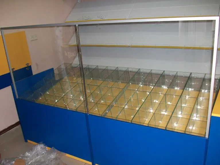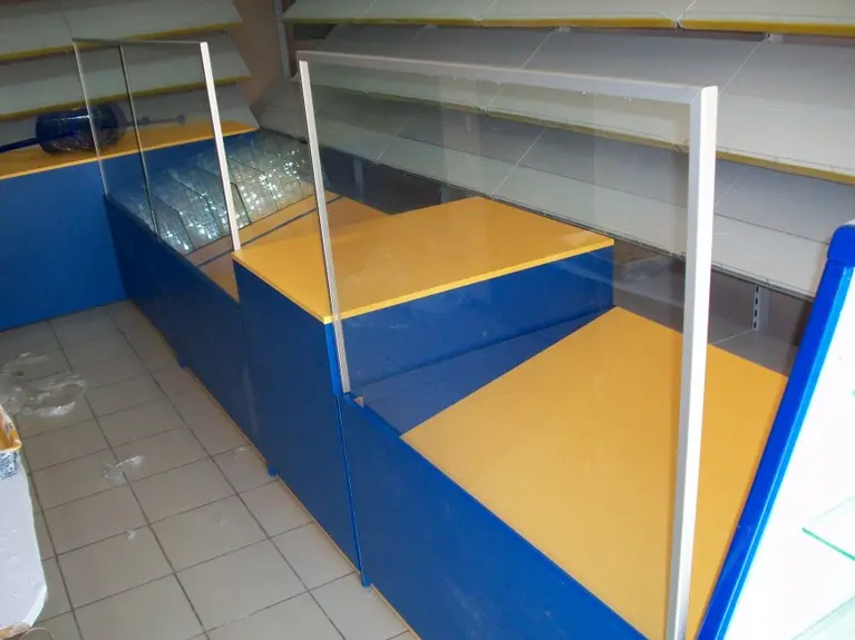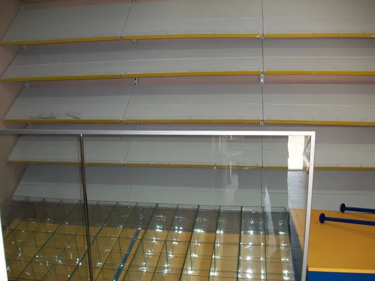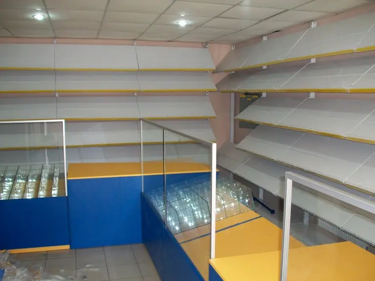 Возле стены установлены металлические универсальные стеллажи, а перед ними прилавки из ДСП и стекла.