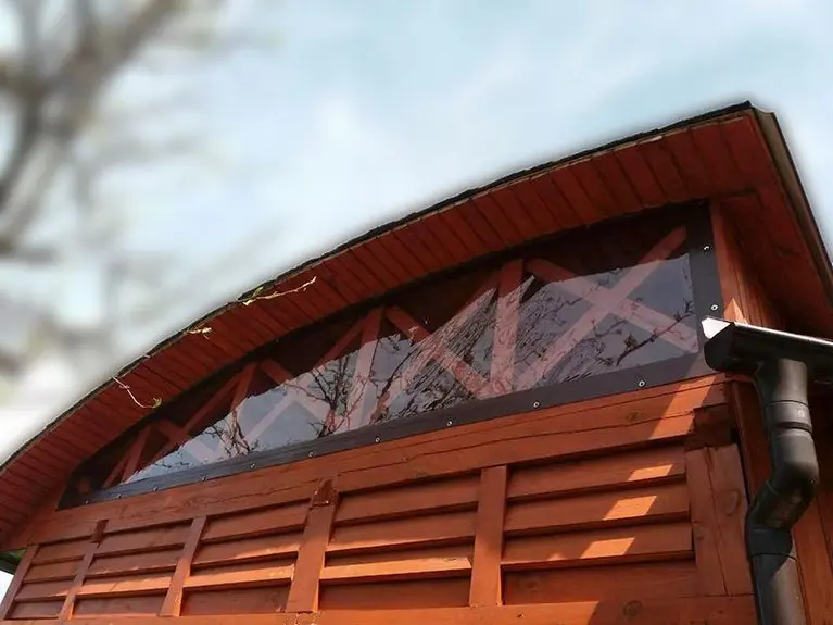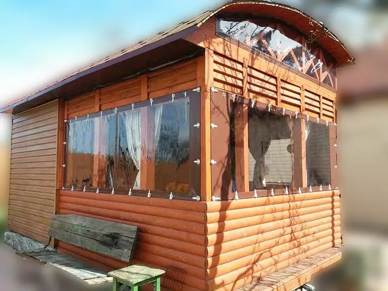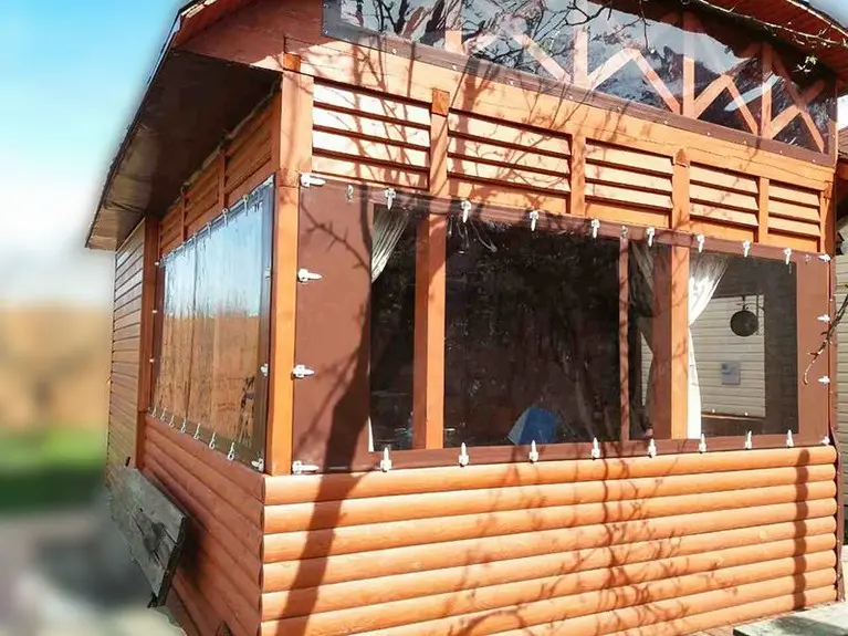 Деревянная беседка с прозрачными ПВХ окнами.