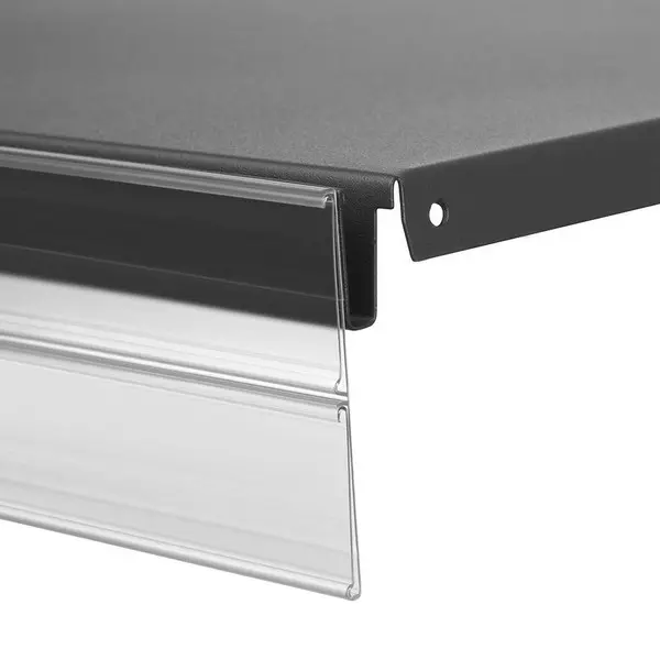 - Ценникодержатели для стеллажей: они крепятся на торцевую часть полки стеллажа при помощи предварительно нанесенного скотча на обратную сторону. Этот тип обеспечивает легкую смену ценников и имеет привлекательный внешний вид.