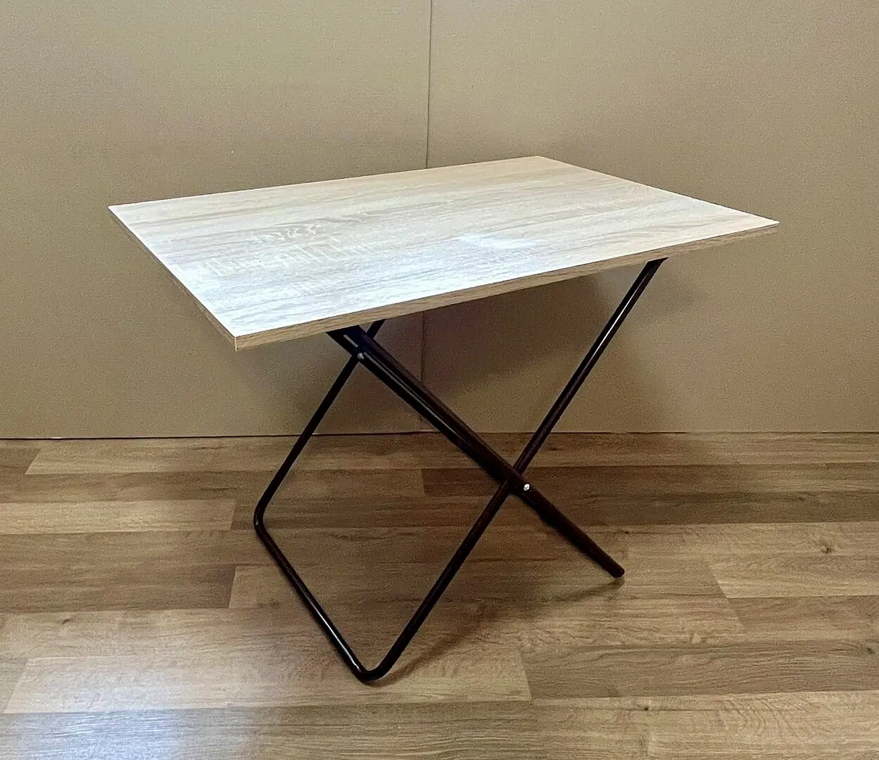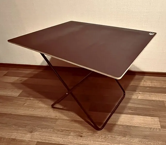 Каркас стола выполнен из квадратной трубы 20х20 мм, а столешница изготовлена из дощечек, зашитых в мешковину (полипропилен). Это обеспечивает не только прочность, но и легкость в использовании и транспортировке.